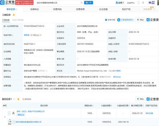 企查查APP显示,近日,武汉市珺雅投资有限公司成立,法定代表人为梅青海,注册资本为5000万元,经营范围包含:自有资金投资的资产管理服务;房地产咨询;企业管理咨询;品牌管理;住房租赁;非居住房地产租赁等。企查查股权穿透显示,该公司由保利发展(600048.SH)间接全资持股。